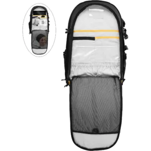The front of the backpack features small, medium, and large pockets and the main zippered compartment, which unzips all the way down providing full front access to your gear. Each side of the backpack provides a mesh slip pocket with a drawstring closure and the base has a zippered pocket, which stores a removable rain cover.