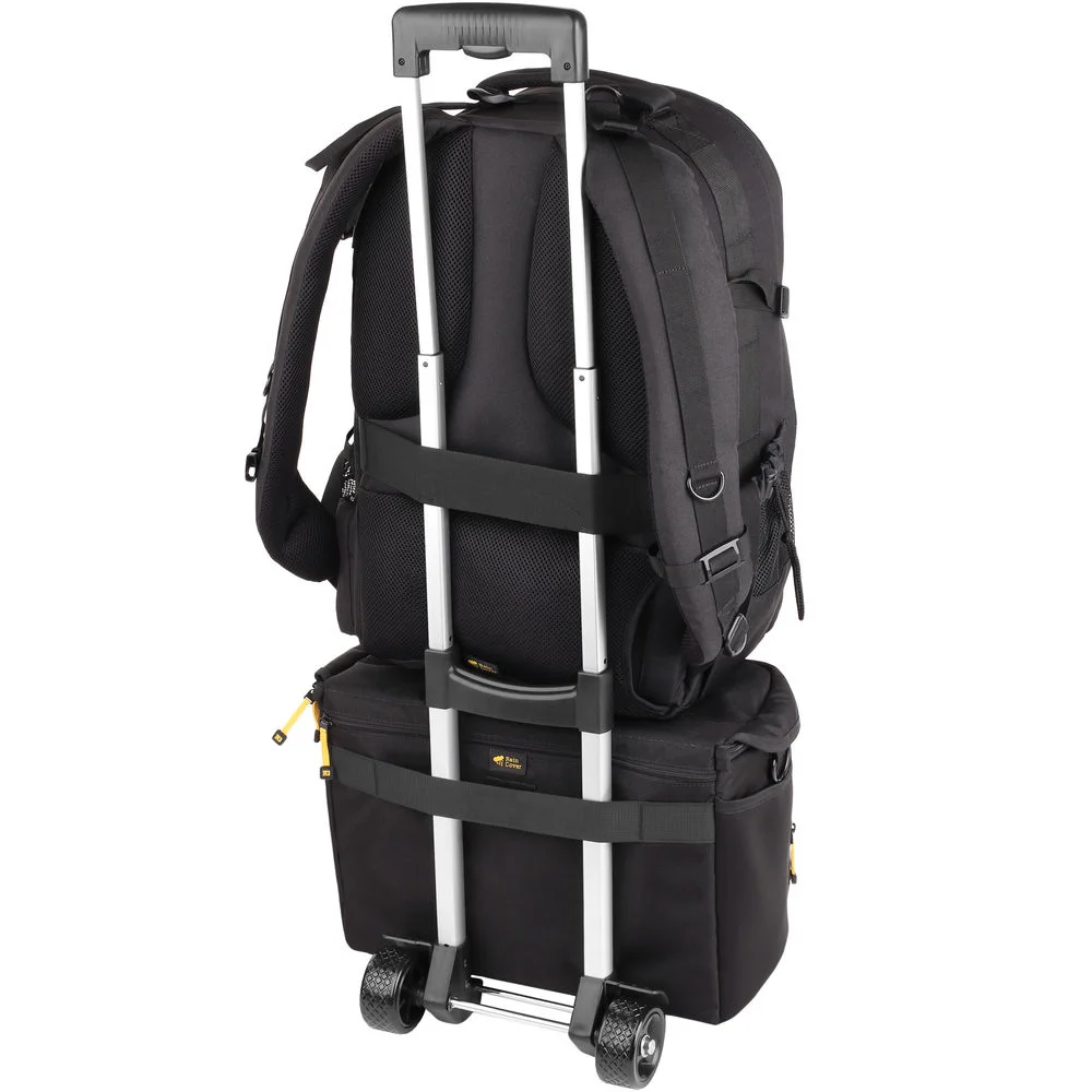 Ideal for traveling and hiking, this black, water-repellentΒ Thunderhead 75 DSLR & Laptop BackpackΒ fromΒ RuggardΒ holds a DSLR with a grip and an attached zoom telephoto lens up to 10″, 8 more lenses, and a flash between padded touch-fastened dividers inside a spacious main compartment. This bag is packed with pockets of all sizes, and one of them is a dedicated compartment which will hold most 17″ laptops. Additionally, there is a side attachment for securely storing your tripod.