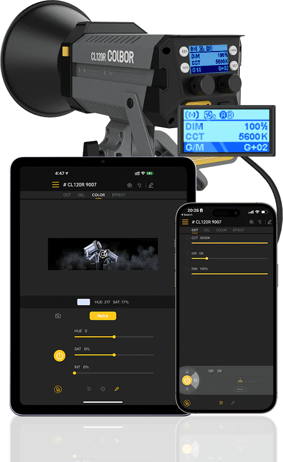 Take complete control of your lighting with the COLBOR wireless control system. Use the COLBOR Studio App or the convenient remote to manage your lights effortlessly. The Mesh Network and 2.4G Channel capabilities allow each light to act as a controlling master in a modular light group. This extends the controlling range up to an impressive 150 meters. Continuous software upgrades enhance the fixture's user experience, while an easy-to-read LCD display ensures intuitive operation.
