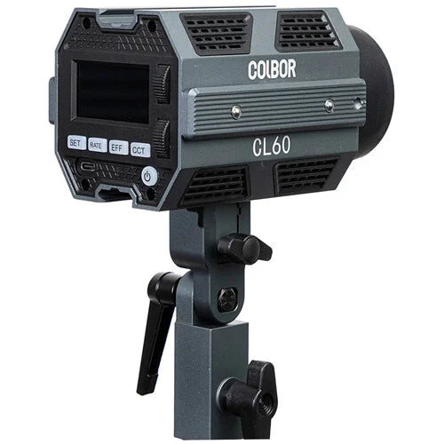 The Colbor CL60 Bi-Color LED Video Light Monolight by COLBOR is a compact, lightweight, and highly portable lighting solution. It utilizes a 2700-6500K COB LED Video Light lamp with an impressive CRI rating of 97. This 65W LED light provides a brightness of 2888 lux at 3.3', which increases to 20,240 lux at the same distance when used with the included reflector. It boasts 10 pre-set special effects for creative lighting effects and features a user-friendly LCD display for easy operation. Adjustments can be made directly on the unit or remotely through a smartphone app.