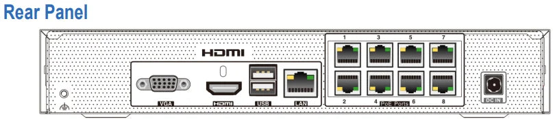 - 8 IP Camera Channels: Supports 8 channels of IP camera input with resolutions ranging from 6MP down to CIF, providing flexibility for various camera types.